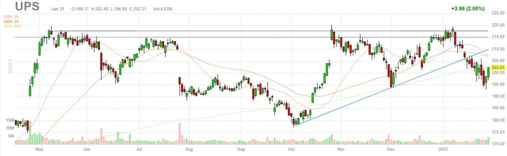 UPS rose to $217.94 (+7.78%) in pre-market trading.