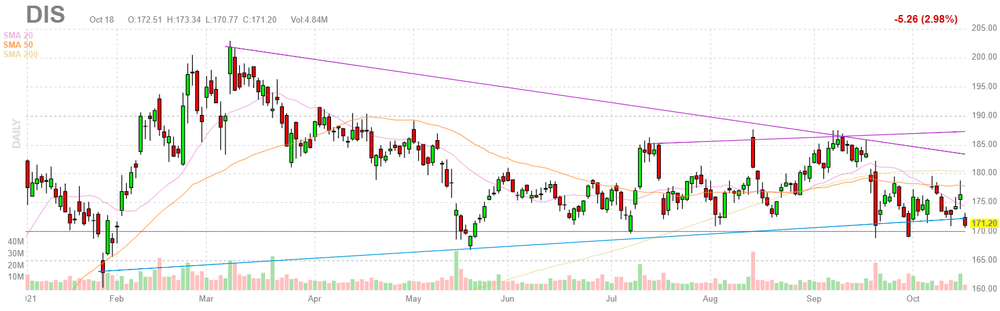 Hа текущий момент акции DIS котируются по $171.20 (-2.98%).