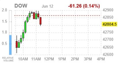 Большинство компонентов DOW в минусе (17 из 30). Аутсайдер - Boeing Co. (BA; -4.92%). Лидер роста - AMGEN Inc. (AMGN; +1.64%).