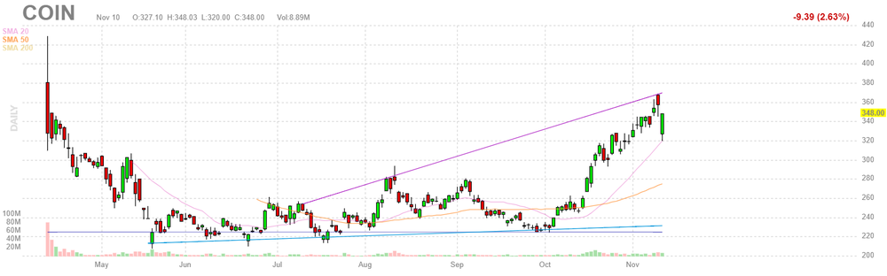 На текущий момент акции COIN котируются по $348.00 (-2.63%).